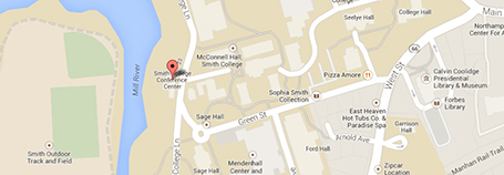 Northampton is off Route I-91 in Massachusetts. Take Exit 18, and follow Route 5 North into the center of town. Turn left onto Route 9 (Main Street). Go straight through four traffic lights, turning left into Smith’s main entrance (College Lane) shortly after the fourth set. The Conference Center is the long yellow building with white metal awning ahead on the right.